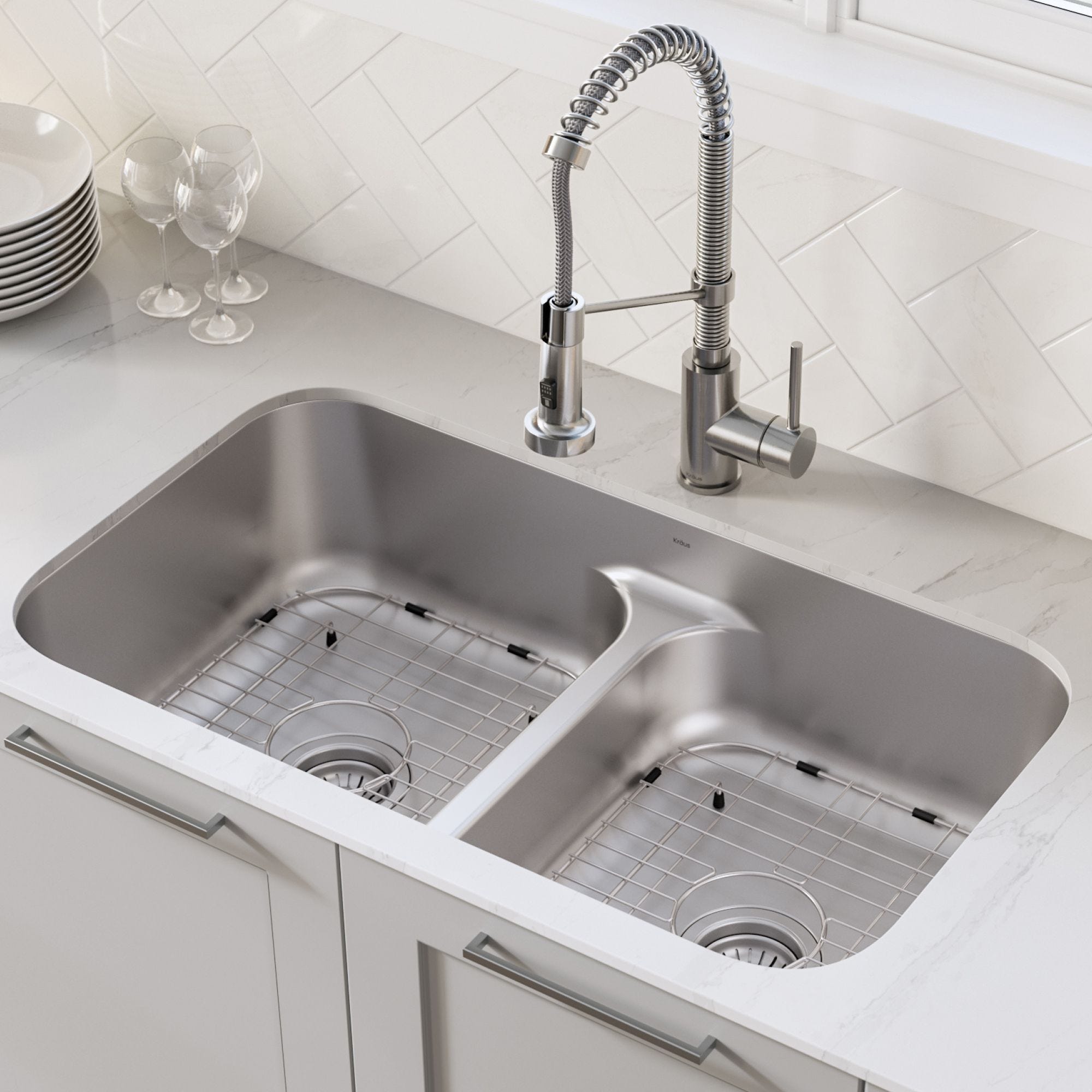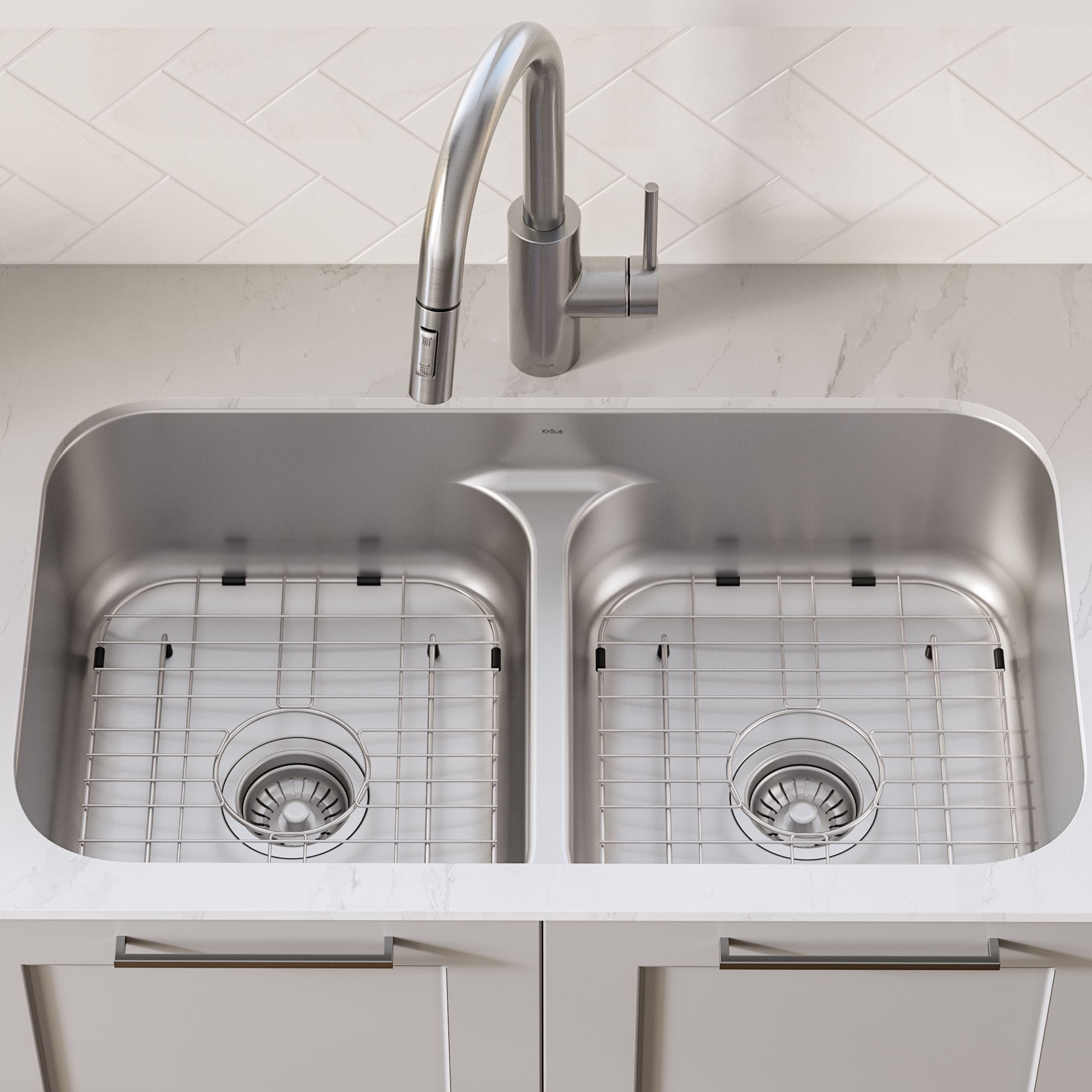 클래식한 싱크대 영감을 받은 디자인과 넉넉하게 둥글게 처리된 청소하기 쉬운 모서리. 낮은 분배기로 스마트한 디자인을 갖춘 이 대용량 <이중 그릇 싱크대를 사용하면 두 개의 싱크대 위에 큰 식기를 세척할 수 있으며 주방 카운터로 넘침을 방지할 수 있습니다. 다양한 주방 조리대와 완벽하게 언더마운트 설치가 가능하도록 설계되었습니다.