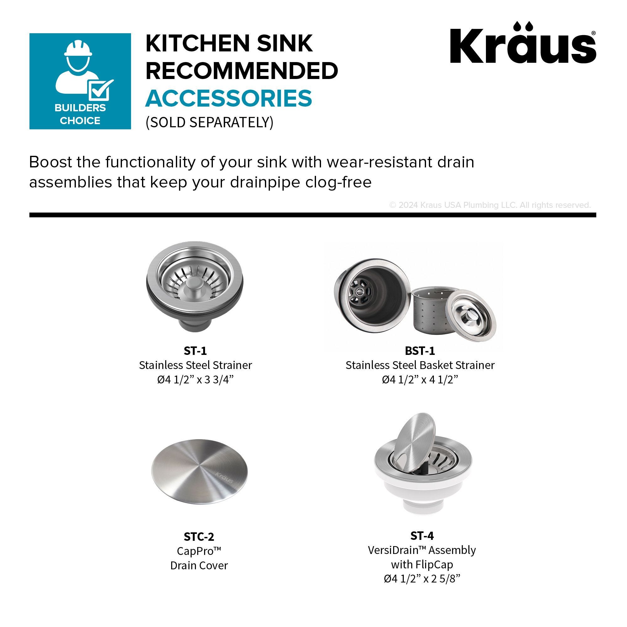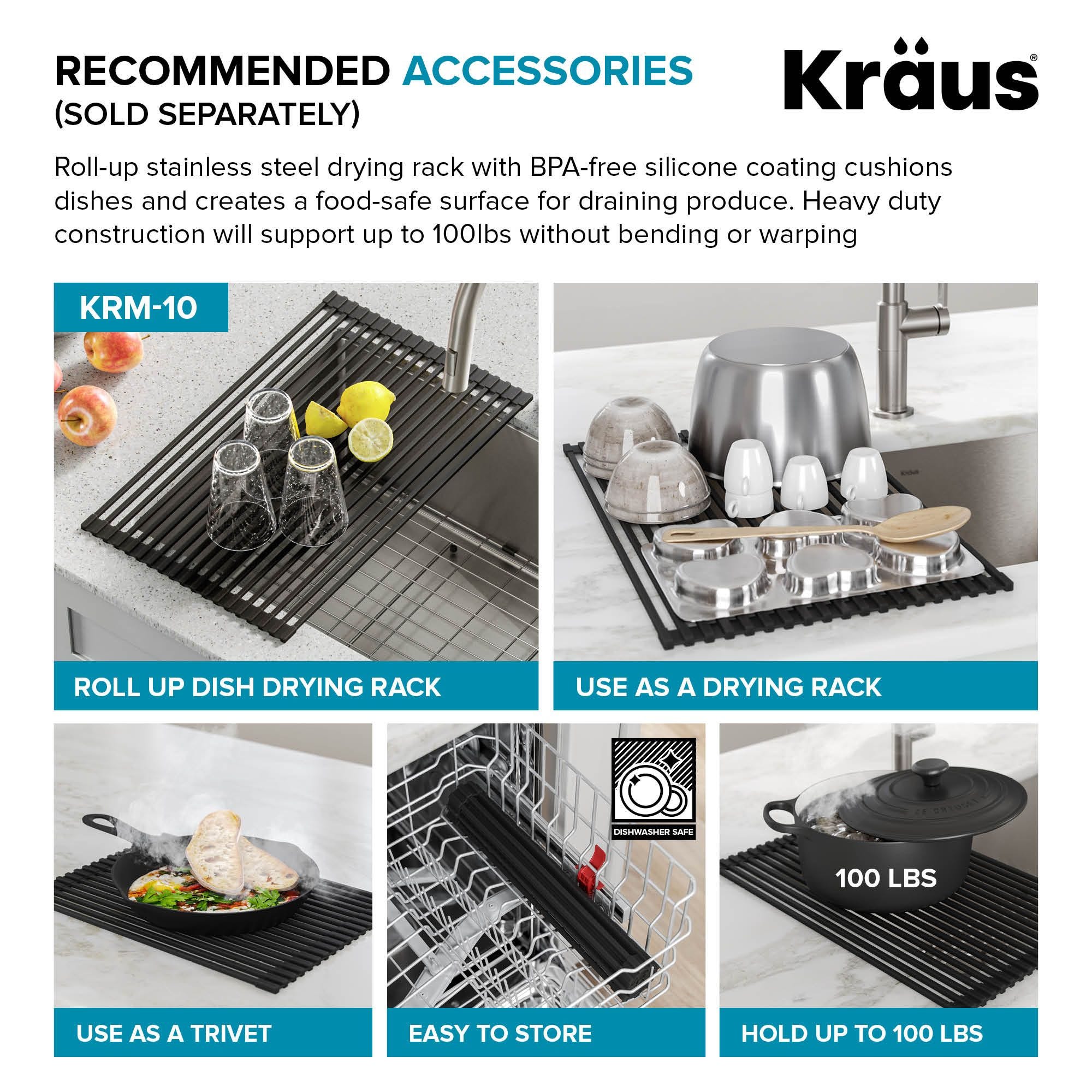 - 권장 액세서리(별매): 스트레이너가 포함된 ST-1 배수 어셈블리, FlipCap이 포함된 ST-4 또는 BST-1 바스켓 스트레이너를 사용하여 배수관이 막히지 않게 유지하세요. 린스 & 롤업 식기 건조대(KRM-10)를 사용하여 싱크대 바로 위에서 식기를 건조하고 요리하세요.