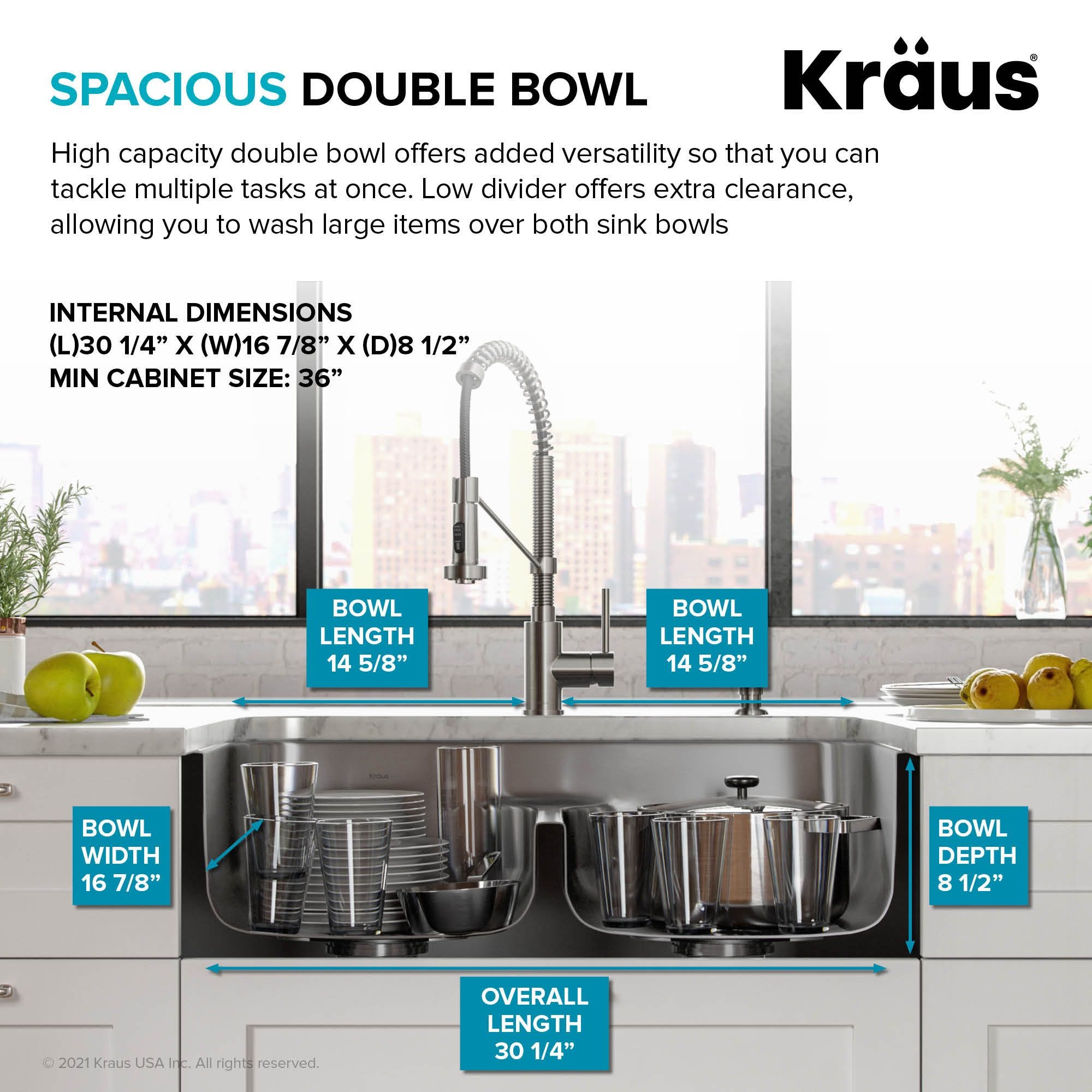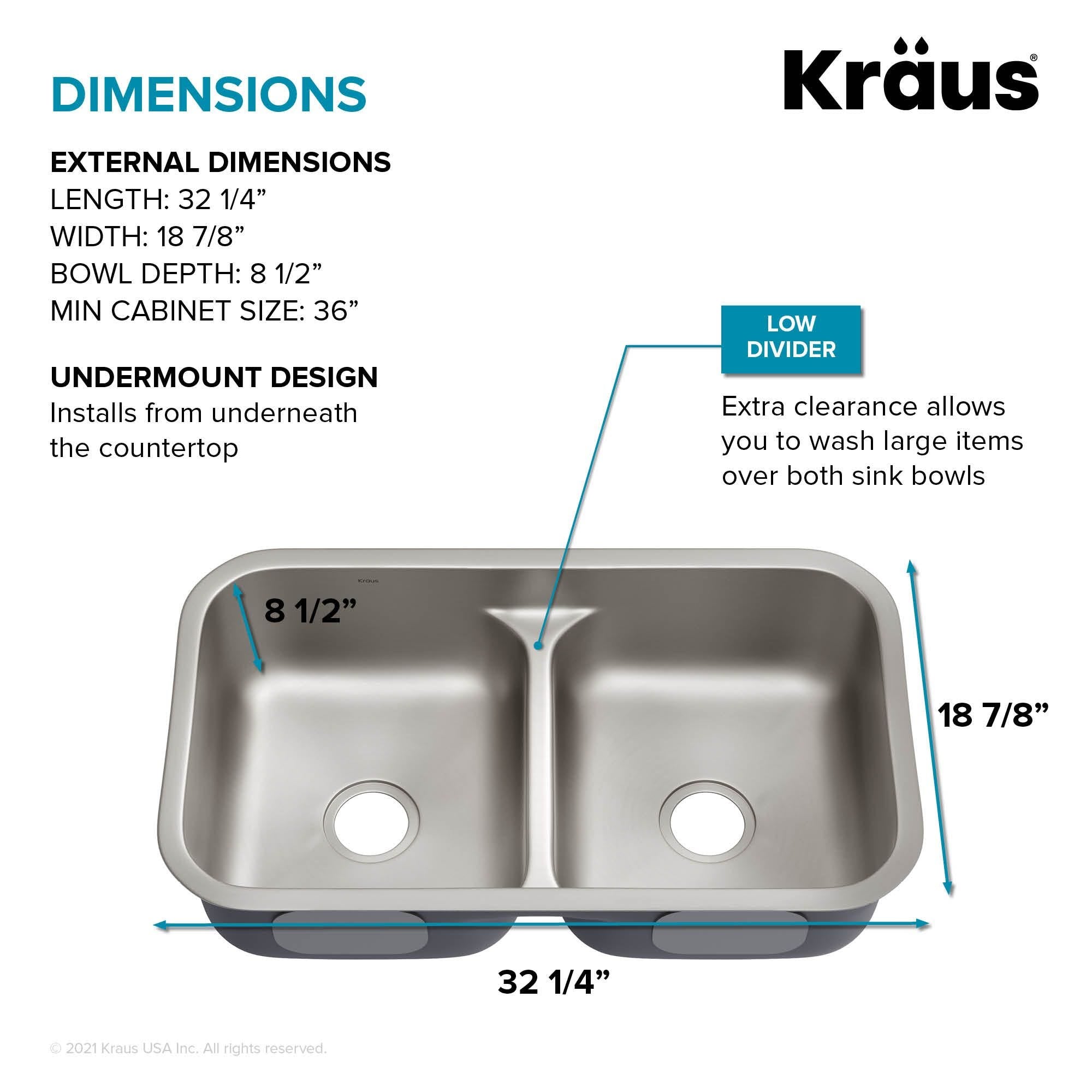 - 외부 싱크 크기: 32 1/4인치 L x 18 7/8인치 W x 8 3/4인치 D - 그릇 크기: 14 5/8인치 L x 16 7/8인치 W x 8 1/2인치 D - 최소 캐비닛 크기: 36인치
