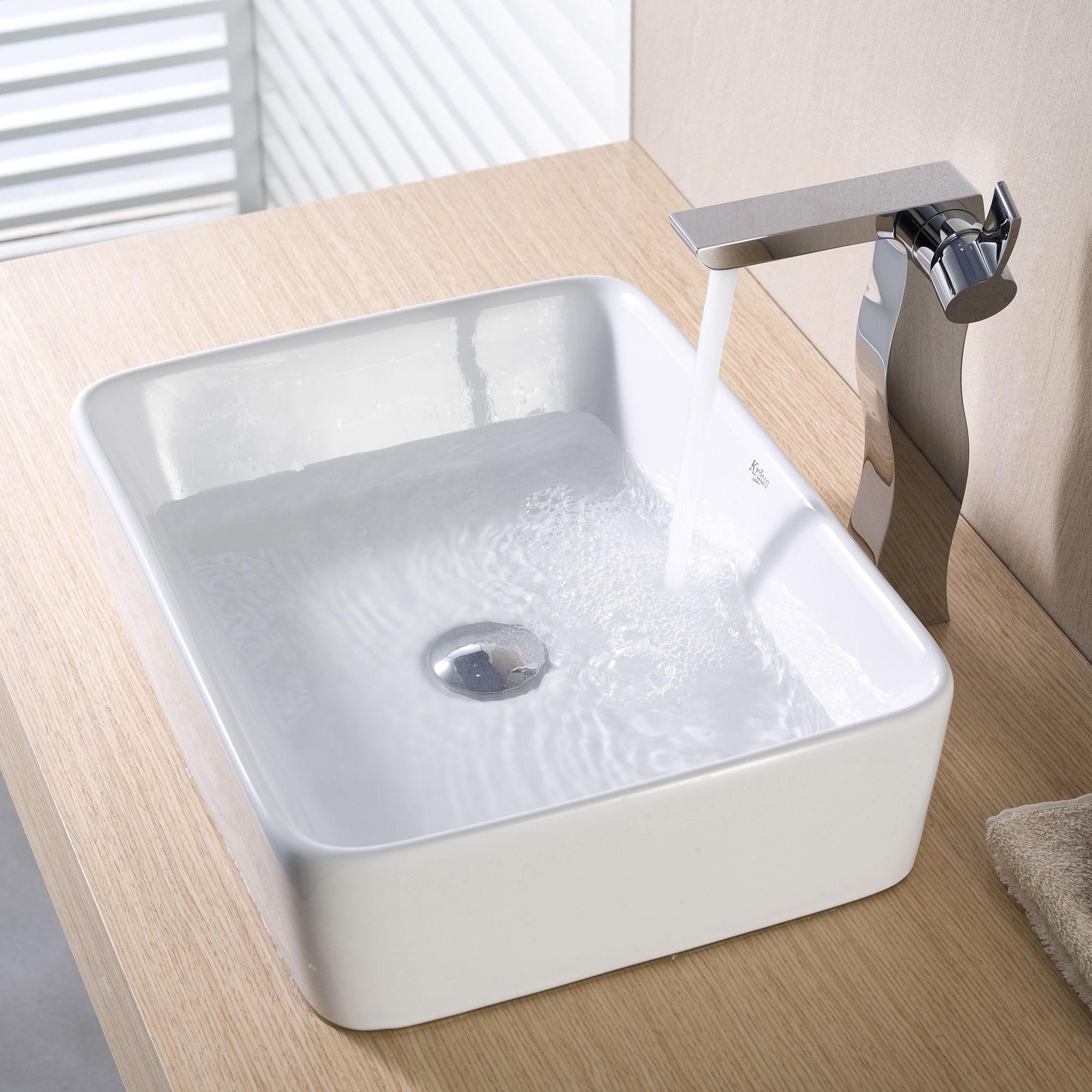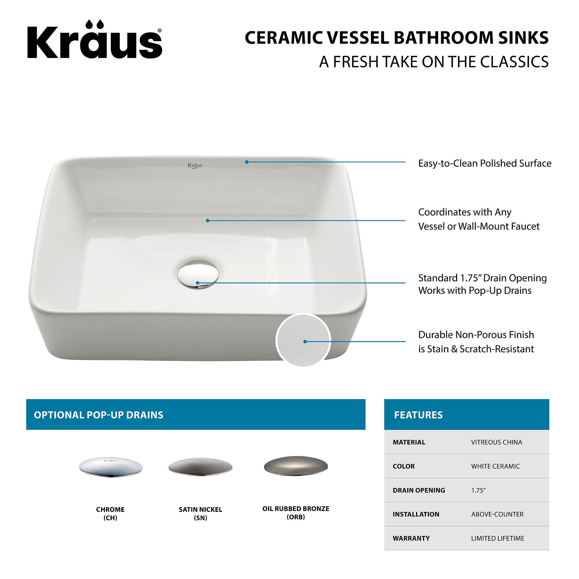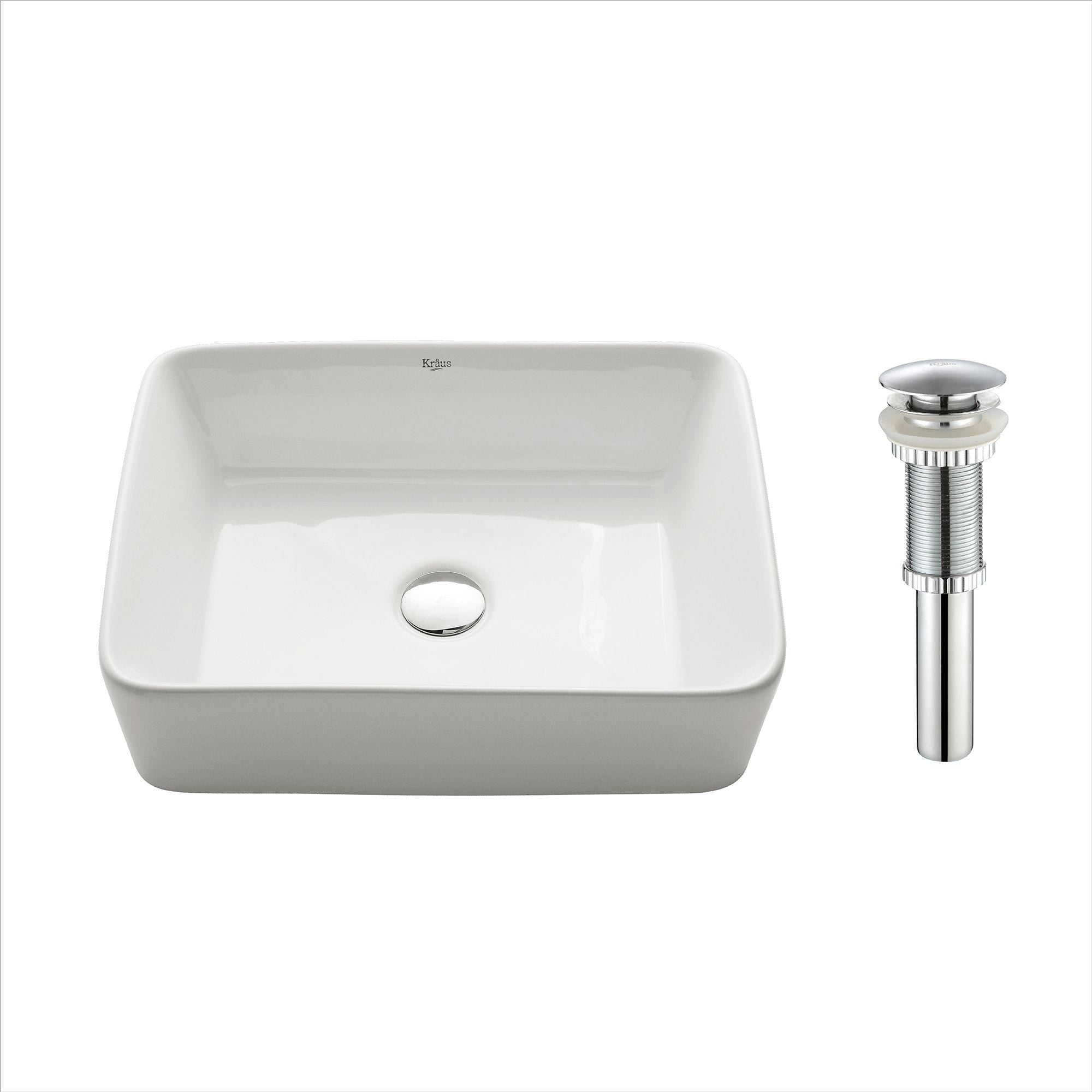 Elavo19" 직사각볼 세라믹 욕실 세면대(화이트, 크롬 팝업 배수구)