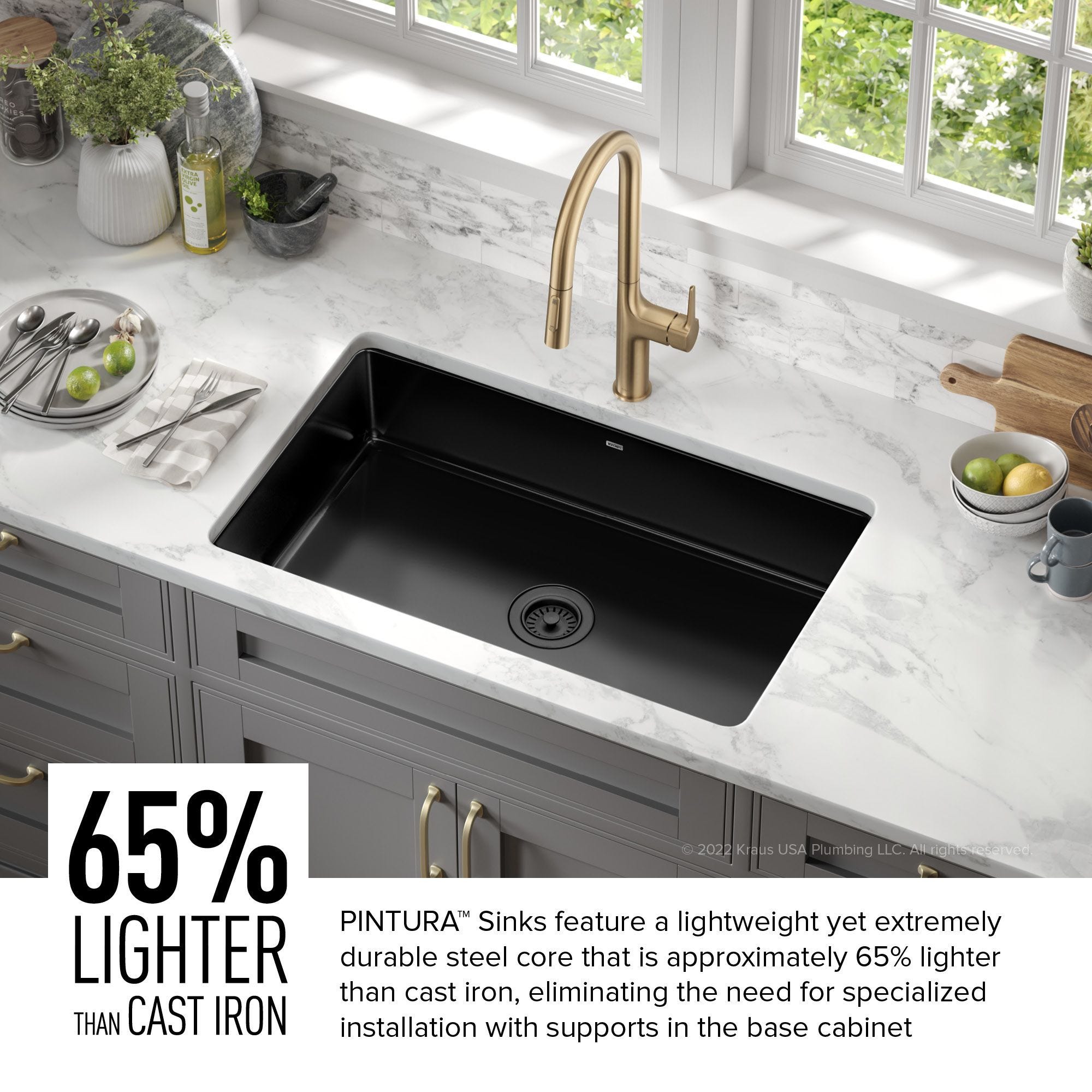 - 주철보다 약 65% 가벼우며 내구성이 뛰어난 강철 코어를 사용하여 오늘날의 주방에 맞게 변형된 클래식 주철 싱크대의 시대를 초월한 매력